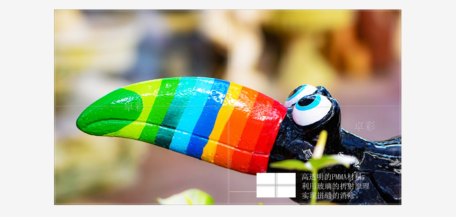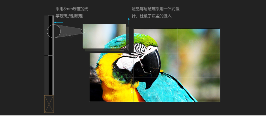 55寸光学无缝拼接屏是在拼接屏的前面增加了一个由高透明的PMMA材料组成的光学玻璃,并利用光的折射原理实现无缝显示的一种技术。