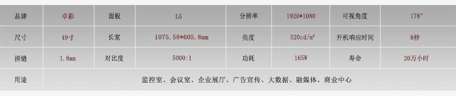 49寸1.8mm液晶拼接屏采用原装LG LCD面板,双边拼缝3.5mm,主要应用于视频监控、会议、展厅等显示场合。