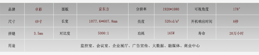 49寸3.5mm拼接屏采用京东方 LCD面板,双边拼缝3.5mm,主要应用于视频监控、会议、展厅等显示场合。