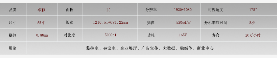 55寸0.88mm拼接屏采用原装LG LCD面板,双边拼缝0.88mm,主要应用于视频监控、会议、展厅等显示场合。